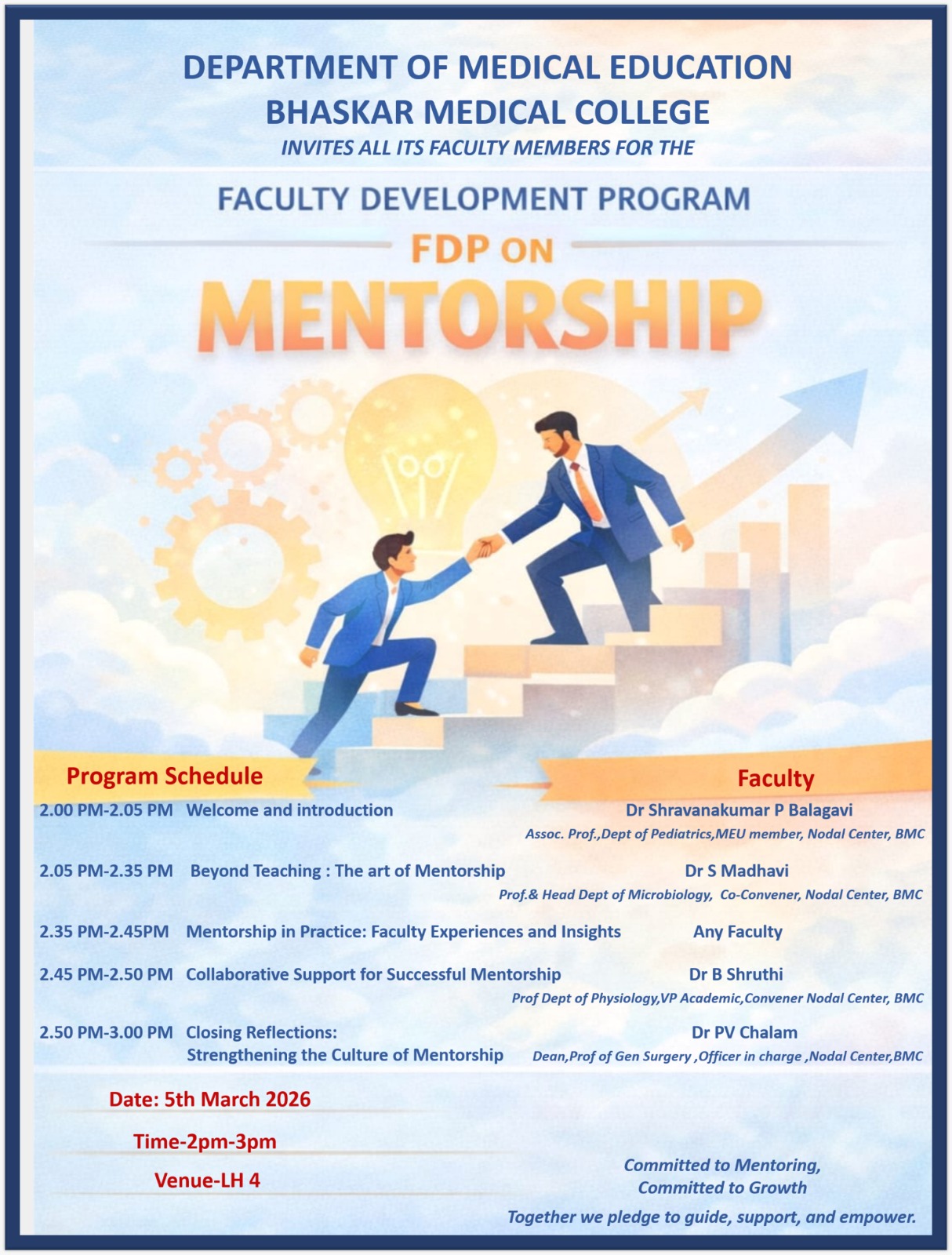 Faculty Development Program on Mentorship. Organized by the Department of Medical Education, Bhaskar Medical College on 5th March 2026, held from 2:00 PM to 3:30 PM at Venue: LH–4.
